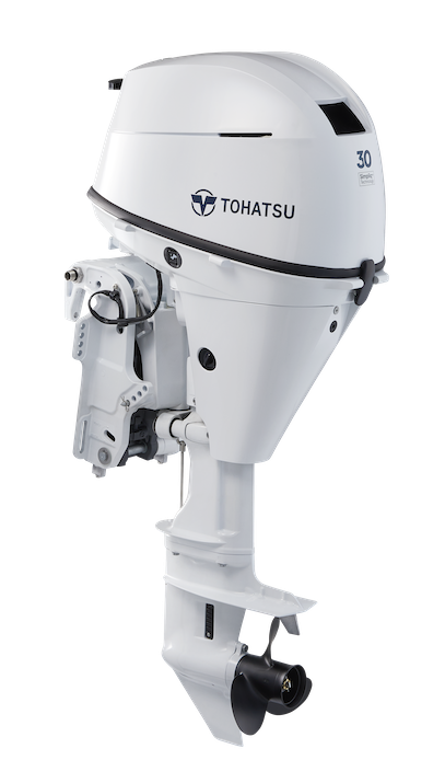 Motor de popa branco TOHATSU 30 com hélice preta