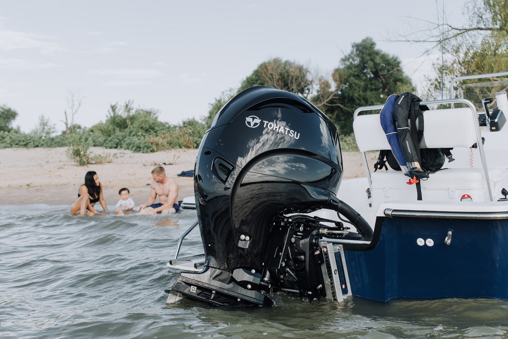 Motor de popa Tohatsu preto numa embarcação azul e branca perto da praia com pessoas sentadas na água