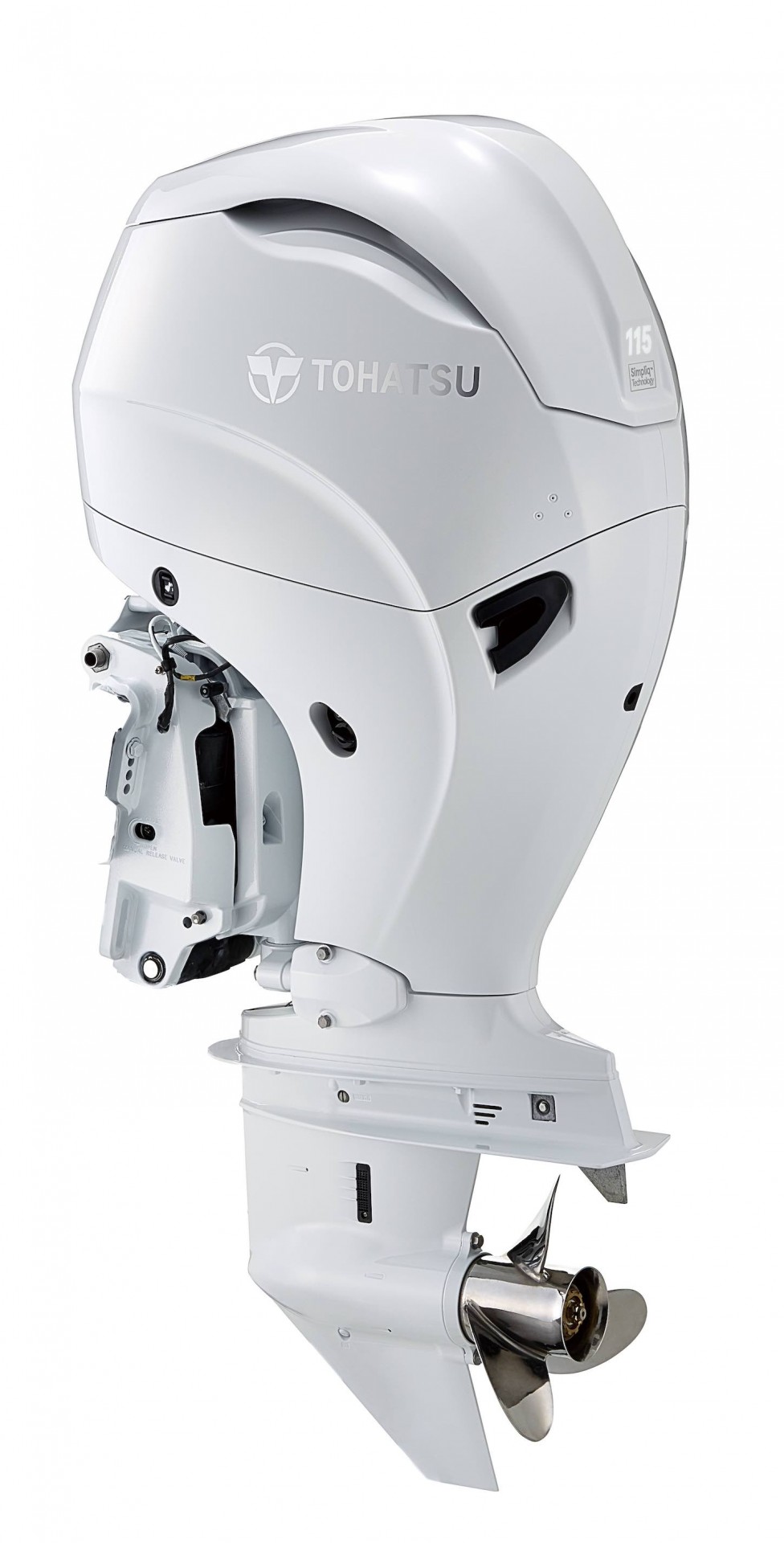 Motor de popa Tohatsu branco com hélice metálica
